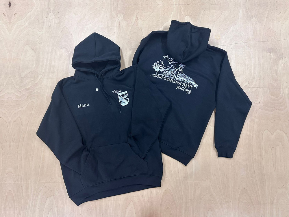 Kreative Logoideen treffen auf stylische Textilveredelung, so wird aus Stoff ein Statement. Dorfgemeinschaft verbindet.